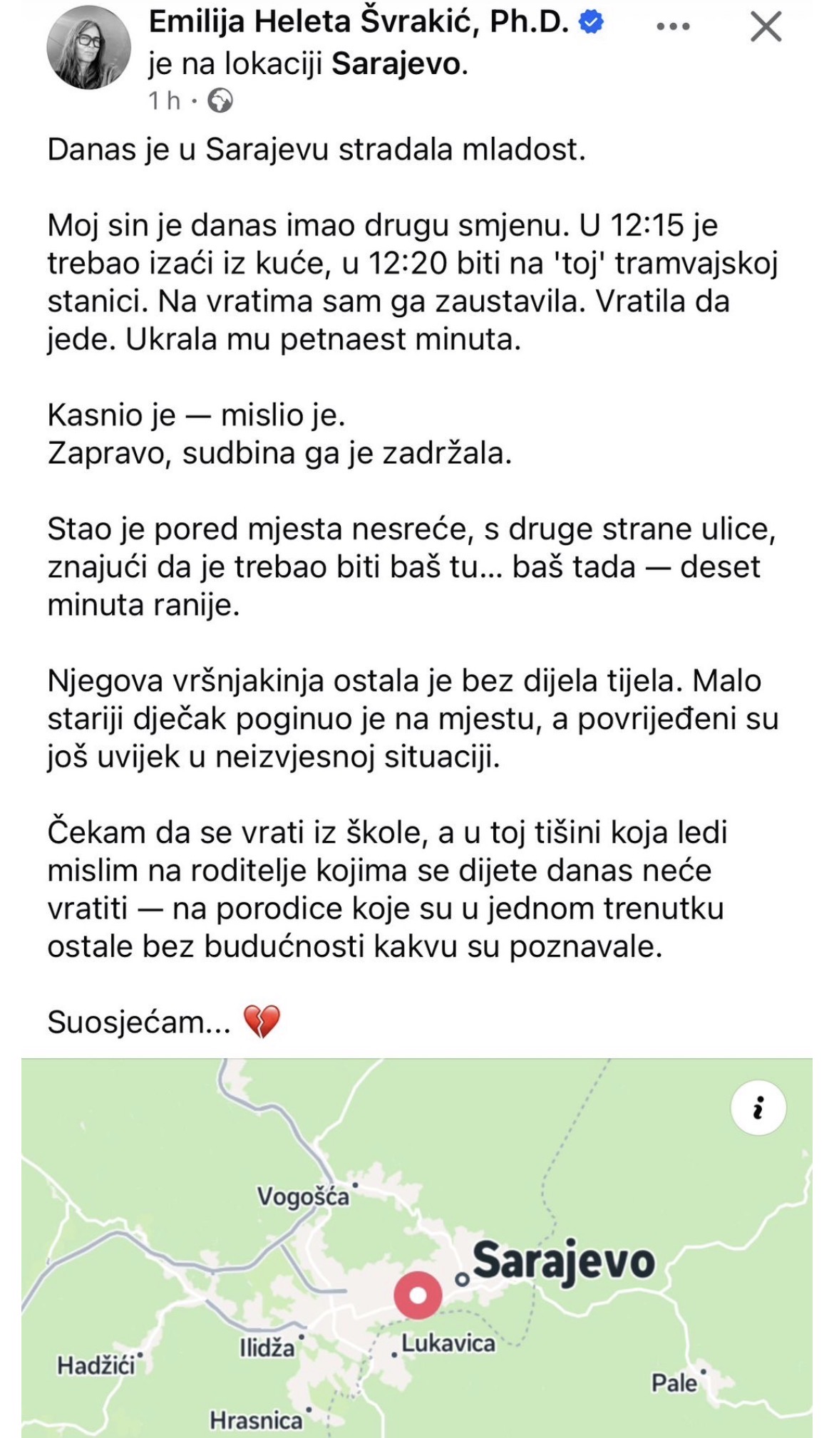 Nakon teške tramvajske nesreće koja je danas potresla Sarajevo, oglasila se Emilija Heleta Švrakić, čija je objava na društvenim mrežama dirnula brojne građane. Ema je na društvenim mrežama podijelila riječi jede majke.